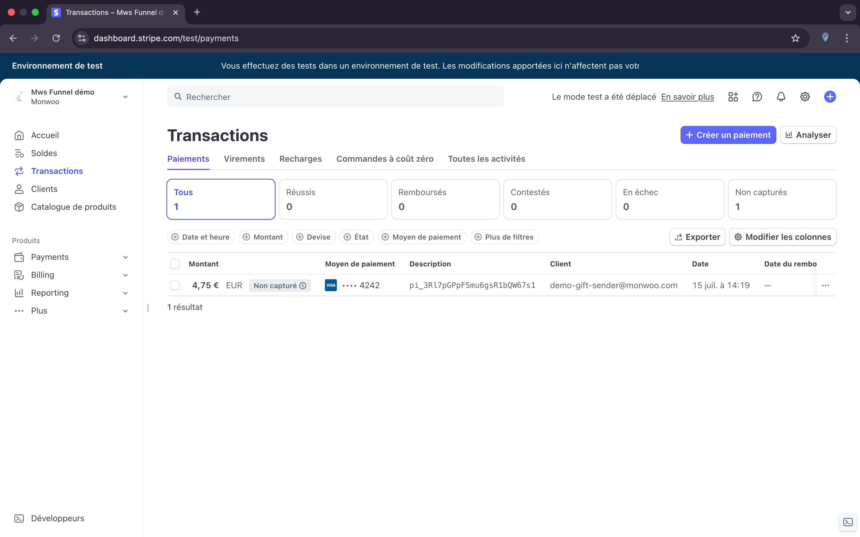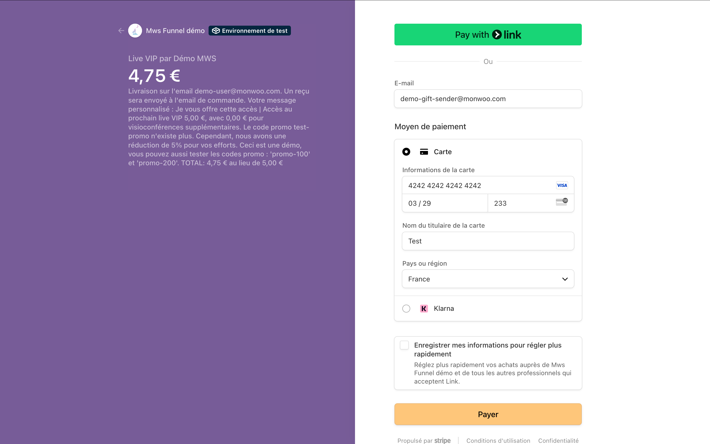 Pour tester un paiement via stripe , utilisez une carte de paiement Stripe de test :